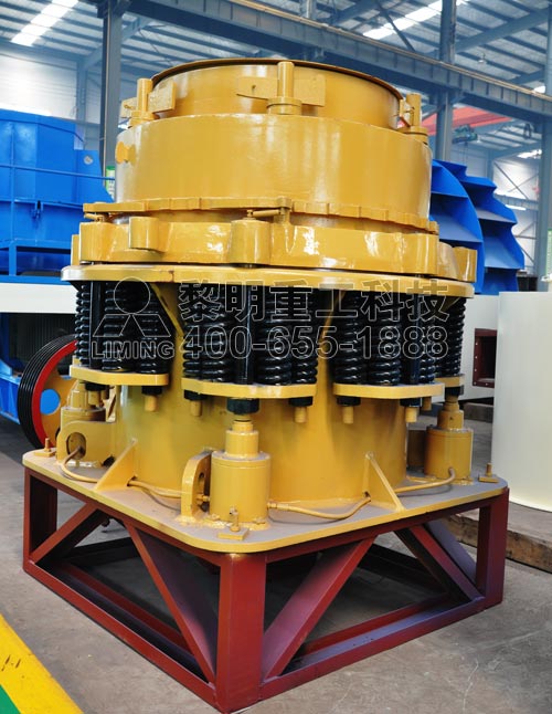四川破碎機(jī)主要部分由機(jī)架、定錐總成、動錐總成、彈簧機(jī)構(gòu)、碗型軸架部和傳動裝置組成。輔助部分由電氣系統(tǒng)、稀油潤滑系統(tǒng)、液壓清腔系統(tǒng)組成。其中定錐總成主要有調(diào)整套、軋臼壁,動錐總成主要由主軸、動錐體、破碎壁組成,傳動部分主要由大帶輪、傳動軸、小錐齒輪、大錐齒輪等組成。